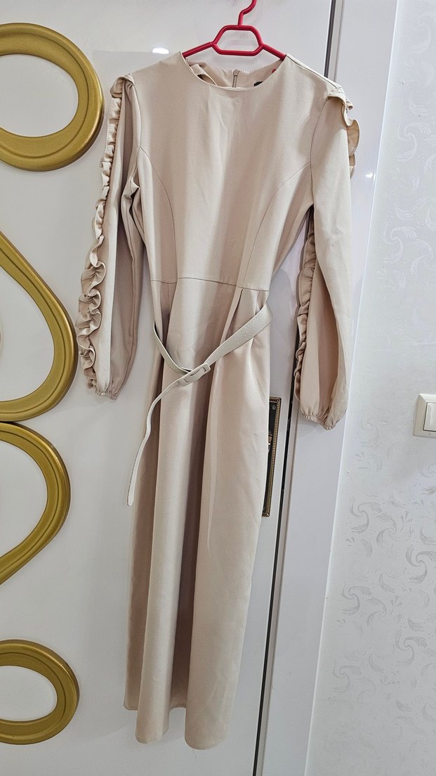 Bej Uzun Kemerli Kadın Elbise