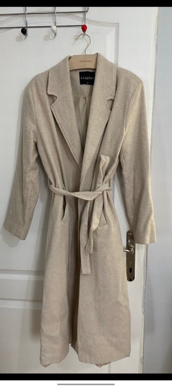 Bej uzun kaban, kesik yaka ve kemerli bel detayına sahiptir. Yumuşak ve sıcak kumaştan üretilmiş, uzun kollu ve desensizdir. Günlük sokak stili için uygundur.