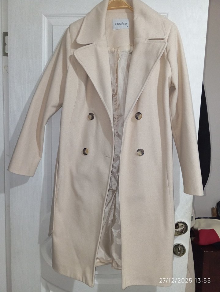 Bej renkli, kemerli ve uzun kesim kadın kaban. Sentetik kumaştan, regular fit ve minimal tarzda, ofis kullanımı için uygun.yeniden farksızdır