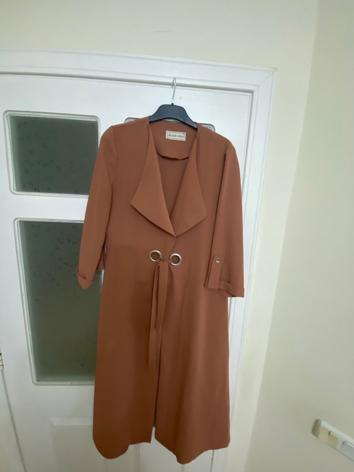 Bej renkli uzun kaban, kemerli ve kesimli yaka detayına sahiptir. Uzun kollu, sentetik kumaştan, ofis şıklığı için uygun rahat bir modeldir. 1 kez giyildi.