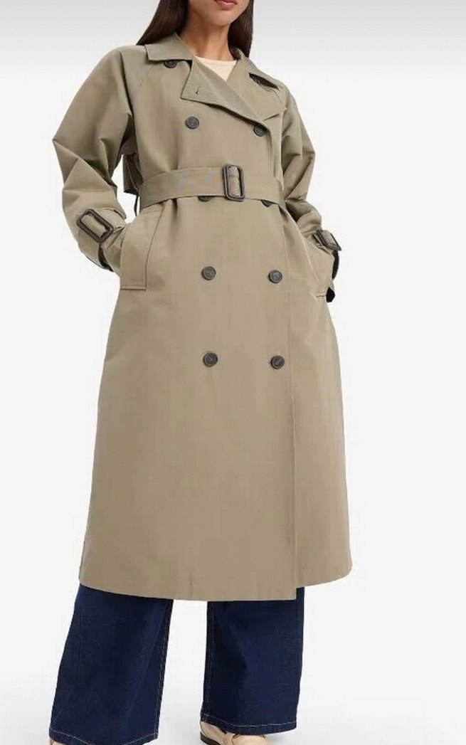 Bej renkli uzun kemerli trençkot, kesik yakalı ve uzun kolludur. Rahat kesim ve sentetik kumaştan, günlük sokak stili için uygundur.
