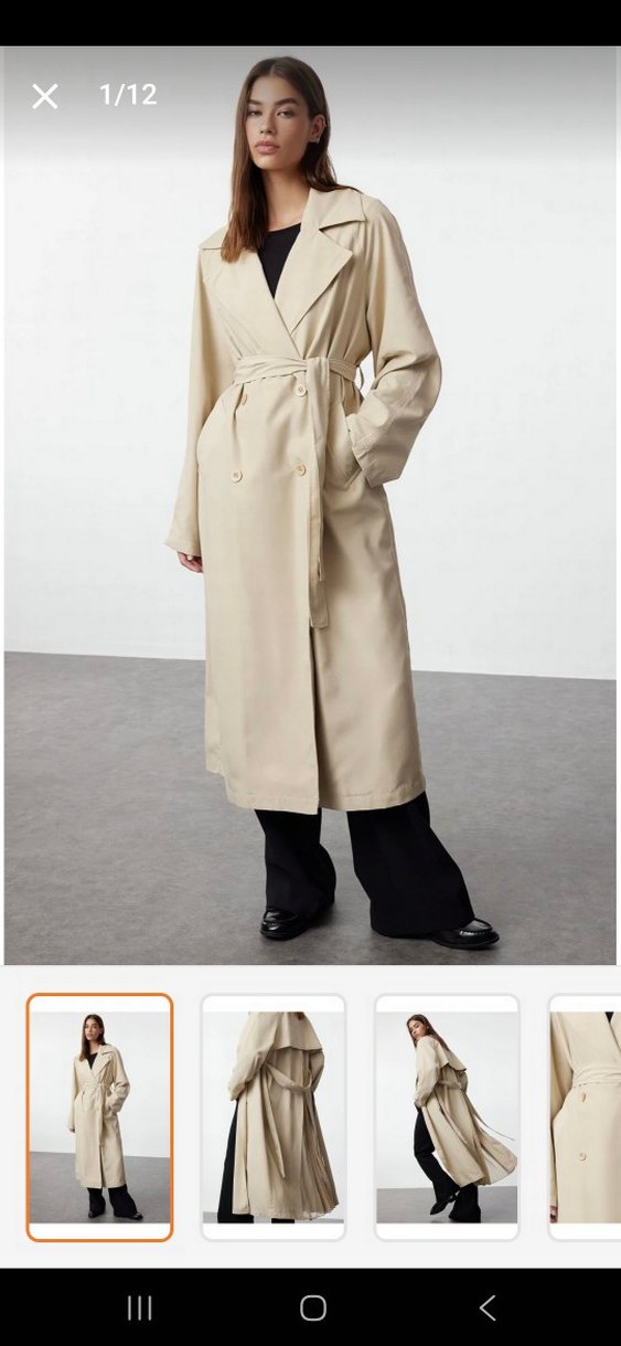 Bej renkli, uzun ve kemerli kadın trençkotu, arka pile detayli trenckot