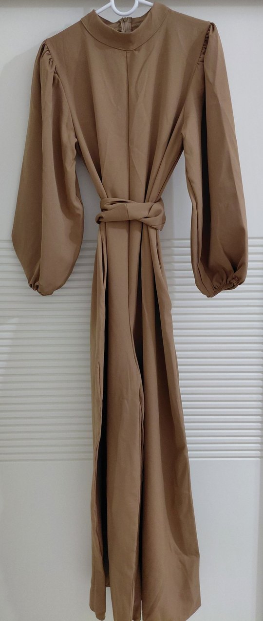 Bej renkli, uzun boylu, kemerli tulum. Boyu uzun geldiğinden hiç giyilmedi.