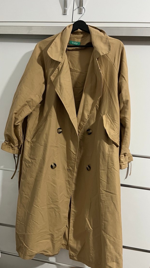Bej renginde, uzun kesim, düğmeli ve keten kumaştan kadın trençkot. Minimalist sokak stiline uygun, notched yakalı ve bol kesimdir. Parlak kumaşı günlük kullanım için idealdir. 1 defa giyildi yeni gibidir