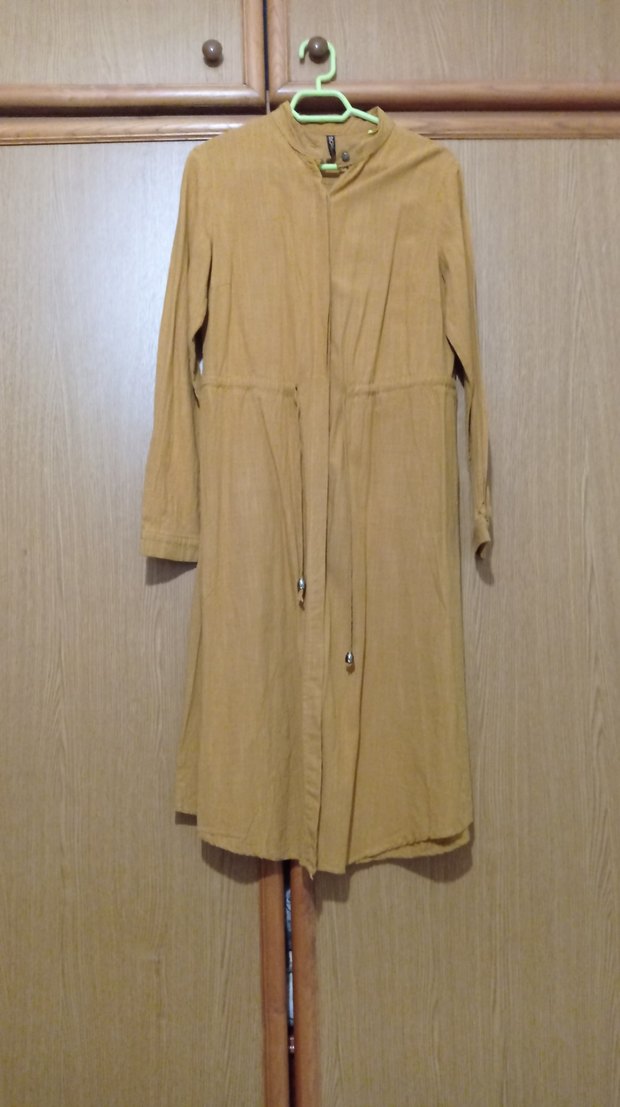 Bej renk uzun kesim, keten kumaştan, düğmeli ve bol kesim hamile kabanı. Uzun kollu, yakası kesik yaka, sade ve bohem tarzda günlük kullanıma uygundur.