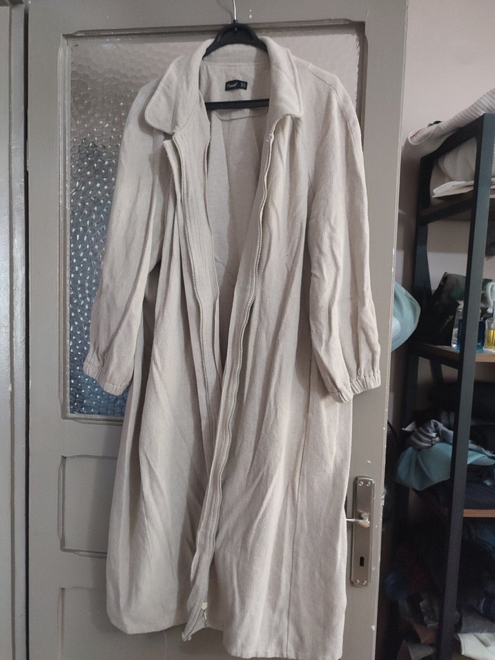 Bej renkte, keten kumaştan uzun ve bol kesim hamile kabanı. Drapeli tasarım ve kesik yaka ile günlük rahat kullanım için uygundur.