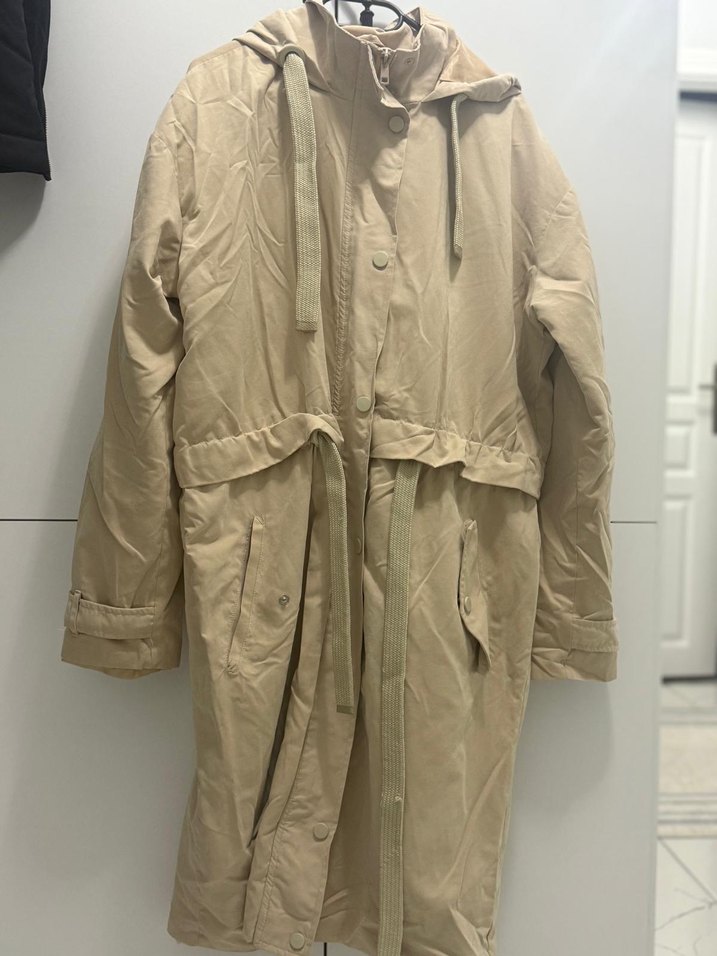 Bej renkli, uzun kesim kadın ceket. Keten kumaştan, düğmeli ve geniş kesimdir. Notlu yaka ve uzun kolludur, rahat sokak stili için uygundur.