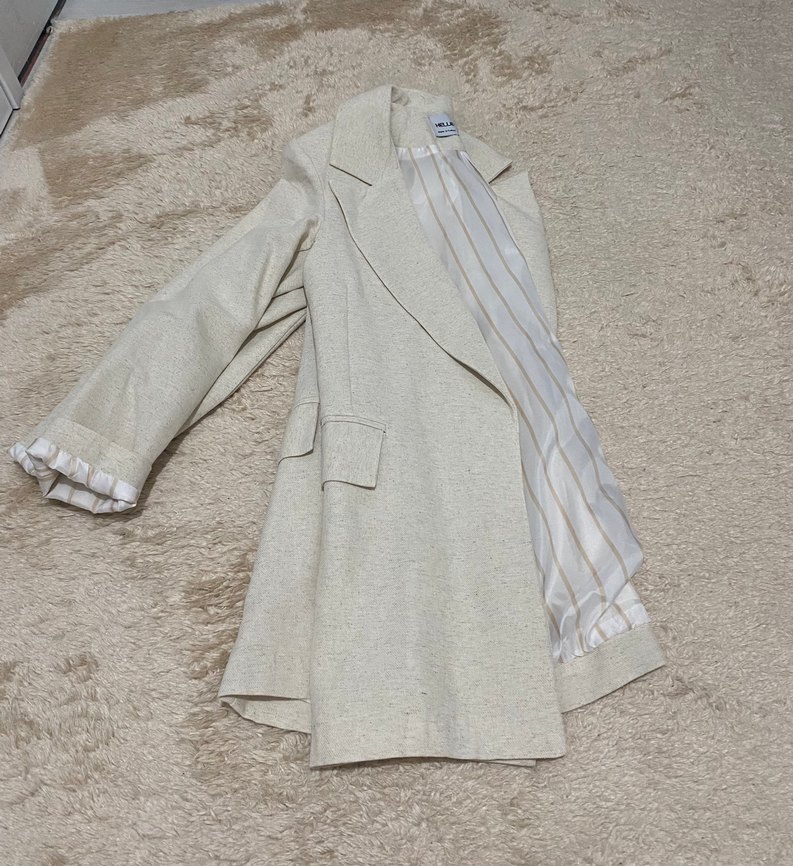 Bej renkte, uzun kesim kadın keten blazer ceket. Düğmeli, kesik yaka ve uzun kolludur. Rahat kesimiyle günlük ve sokak stiline uygundur. Hiç giyilmedi