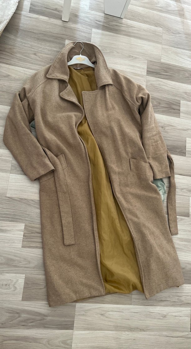 Bej uzun kesim kadın keten kaban, yakası kesik ve bol kesimdir. Yumuşak keten kumaştan yapılmış, uzun kollu ve drapeli tasarıma sahiptir. Günlük kullanıma uygundur. Kaliteli kaban
