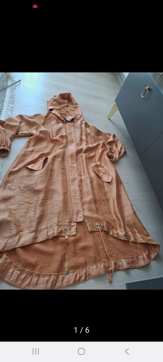 Bej renkli, keten kumaştan uzun kesim, bol ve drapeli kadın yağmurluğu. Notlu yakalı ve parlak dokusuyla sokak stiline uygun, günlük kullanıma ideal. ️