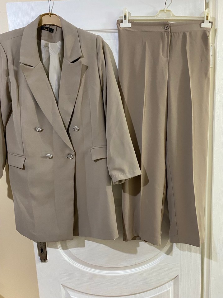 Bej uzun kesim, düğmeli keten kumaştan kadın blazer ceket ve pantolon takımı. Modern klasik tarzda, ofis için uygun, regular fit ve yakasında kesik detay bulunur.