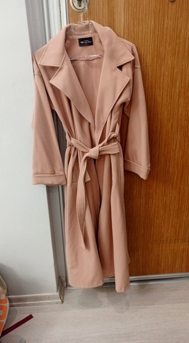 Bej renkli, uzun kesim kadın trençkot, yakası kesik ve bol kesimdir. Uzun kollu, kuşaklı ve rahat bir tarz sunar.