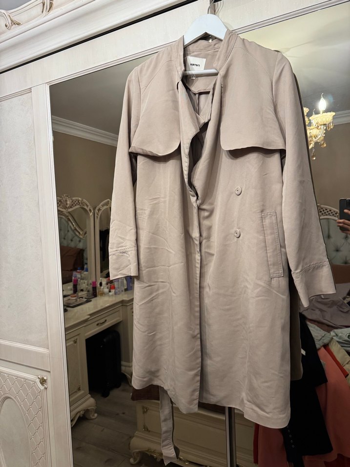 Bej renkte, uzun kesim, düğmeli ve geniş yakalı kadın trençkot. Rahat kalıp ve yumuşak sentetik kumaştan yapılmıştır.