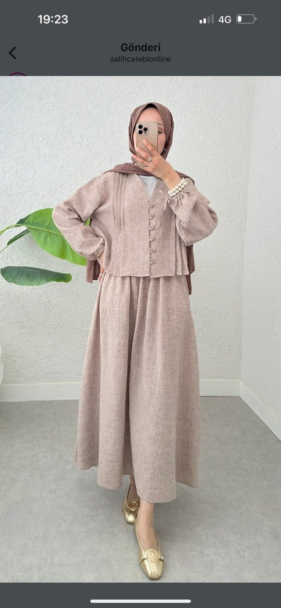 Bej Uzun Keten Bohem Düğmeli Etekli takım