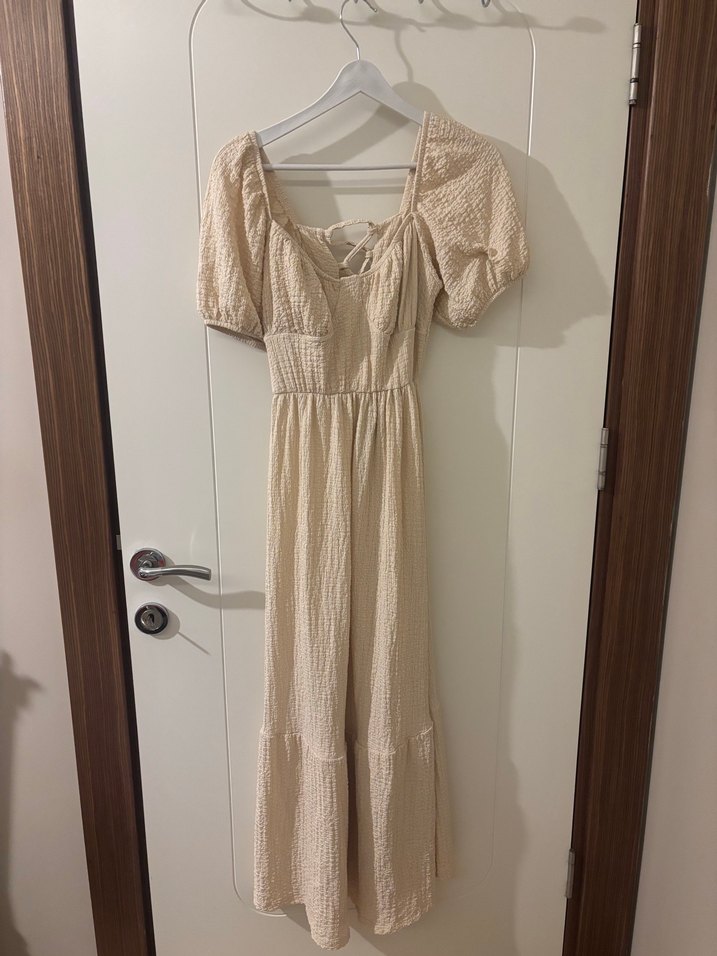Bej renkte, keten kumaştan üretilmiş uzun ve bol kesim elbise. Pilili detaylara ve kayık yaka tasarımına sahiptir. Askılı kollarıyla bohem tarzını yansıtır.