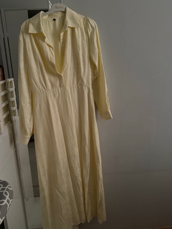 Bej renkli, keten kumaştan uzun, bol kesim elbise. V yaka ve uzun kollu, drapeli vintage bohem tarzda günlük kullanım için uygundur.