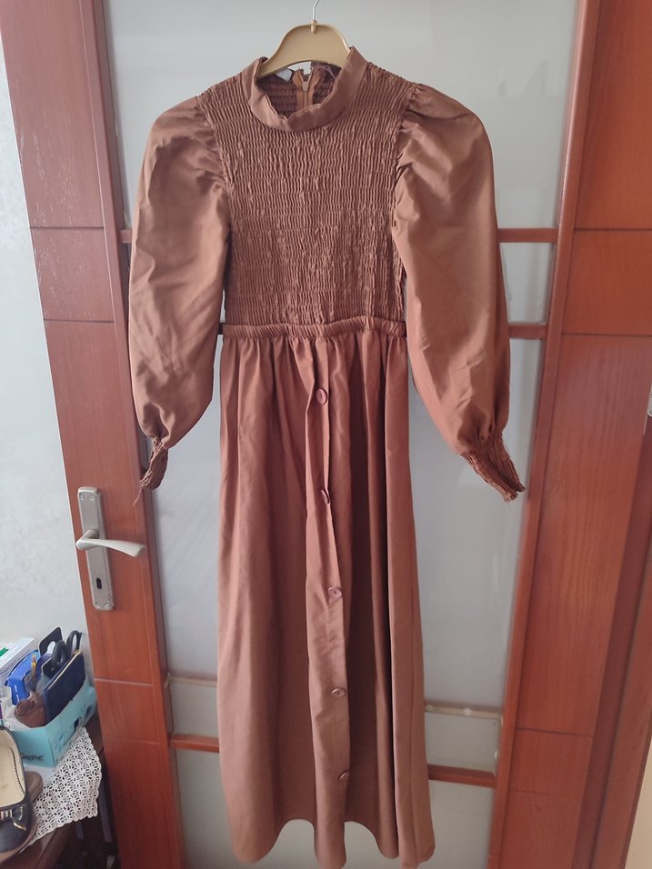 Bej renkte, keten kumaştan uzun, bol kesim, yüksek yakalı, uzun kollu bohem tarzda elbise. Günlük kullanıma uygun şık ve rahat.