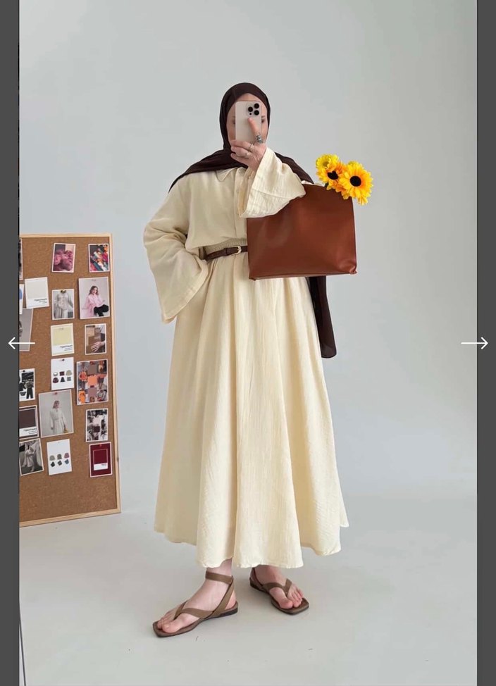 Bej renkli, keten kumaştan uzun elbise, yüksek yakalı ve askılı kolludur. Salaş ve mütevazı kesimiyle bohem ve minimalist tarzda, zahmetsiz şıklık sunar.
