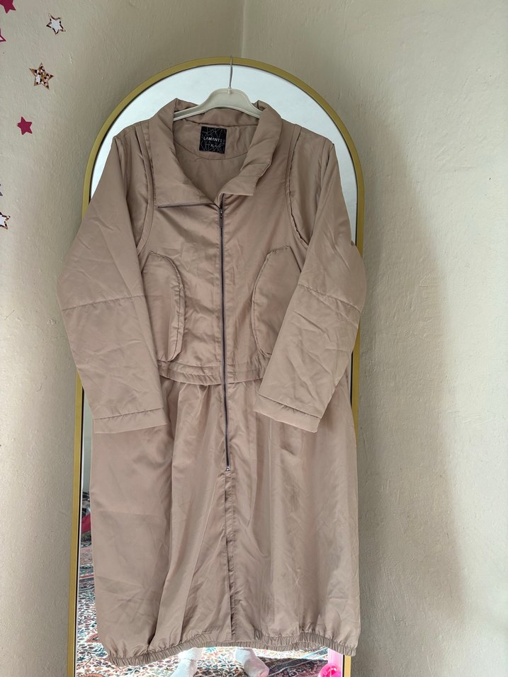 Bej renkli, keten kumaştan yapılmış uzun ve bol kesim ceketi. Fermuarlı ön kısmı, uzun kolları ve keskin yakasıyla günlük sokak stili için uygun.