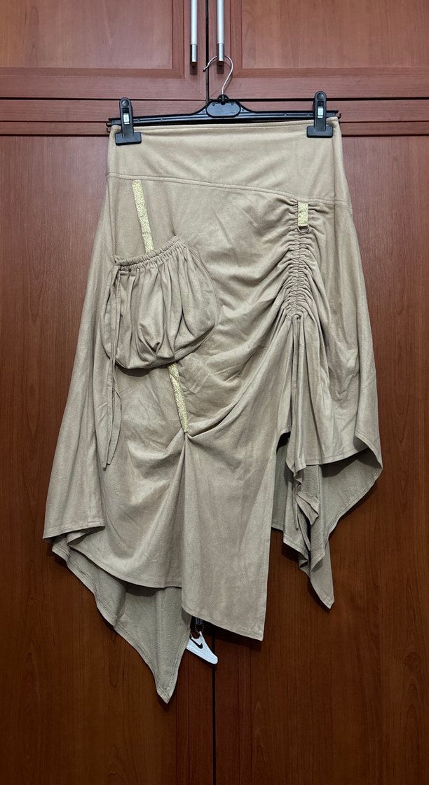 Bej renkte uzun süet kumaştan, bol kesim ve drapeli detaylara sahip bohem ve avangart tarzda etek. Günlük kullanıma uygundur.