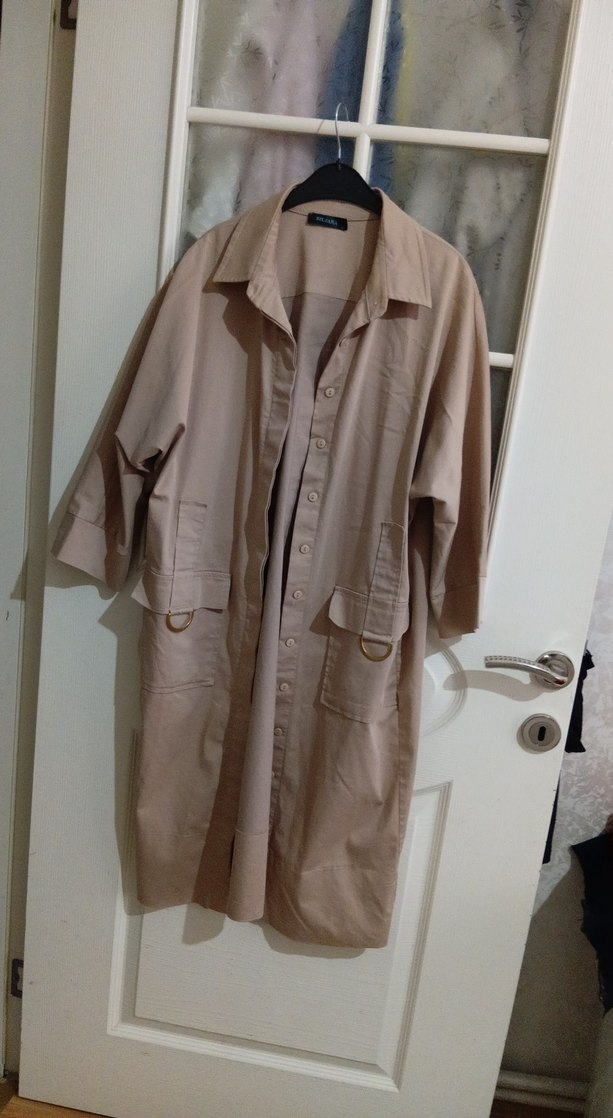 Bej renkli, uzun kesim keten ceket, düğmeli ve notlu yaka detaylıdır. Gevşek kesimi ve yumuşak dokusuyla günlük rahat sokak stiline uygundur.