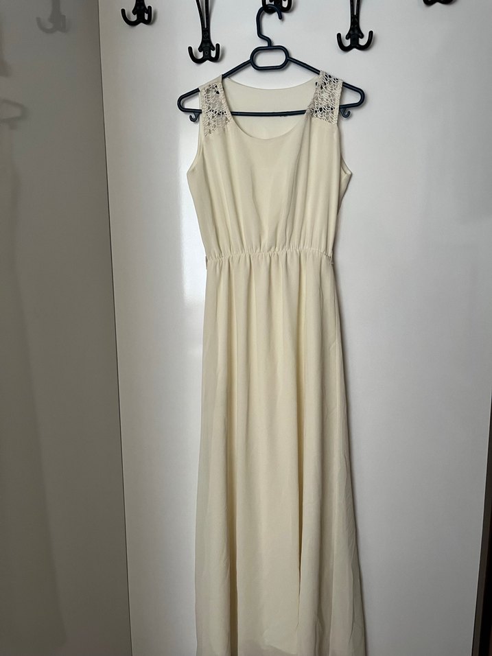 Keten kumaştan yapılmış bej uzun elbise, salaş kesim ve kolsuz tasarıma sahiptir. Straplez yaka ve zarif drapelerle süslenmiştir, düğünler için uygundur.