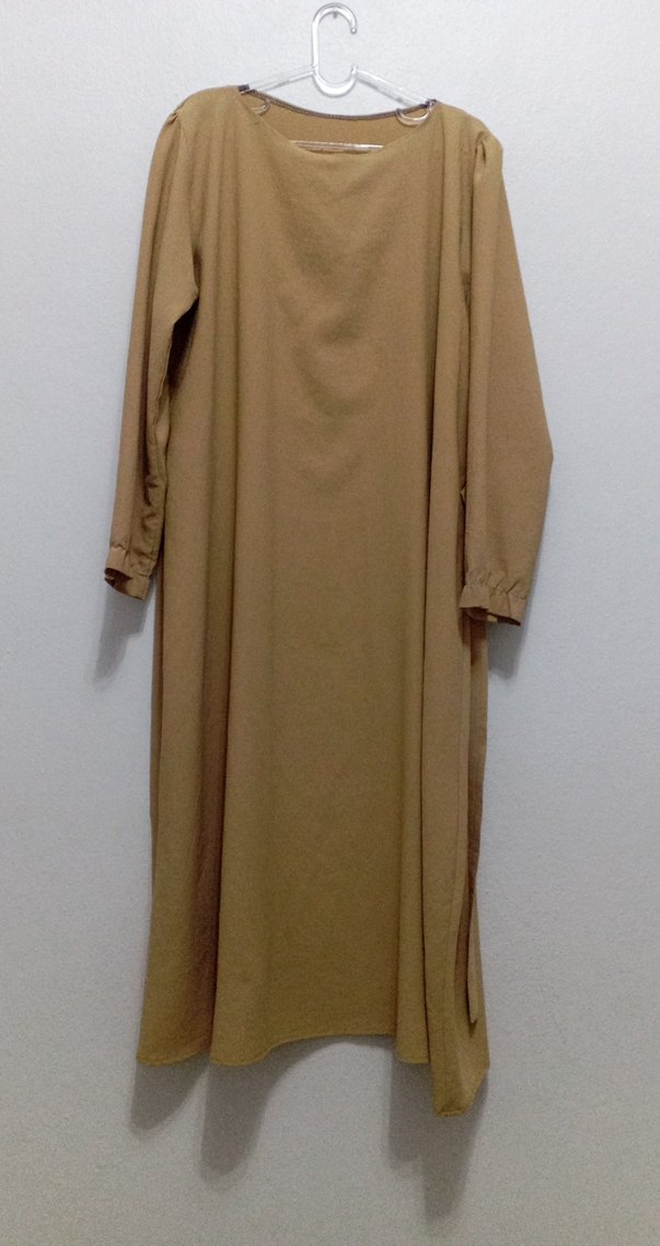 Bej uzun keten elbise, bol kesim ve drapeli detaylara sahiptir. Uzun kollu ve kayık yaka, sade ve mütevazı günlük stil için uygundur.