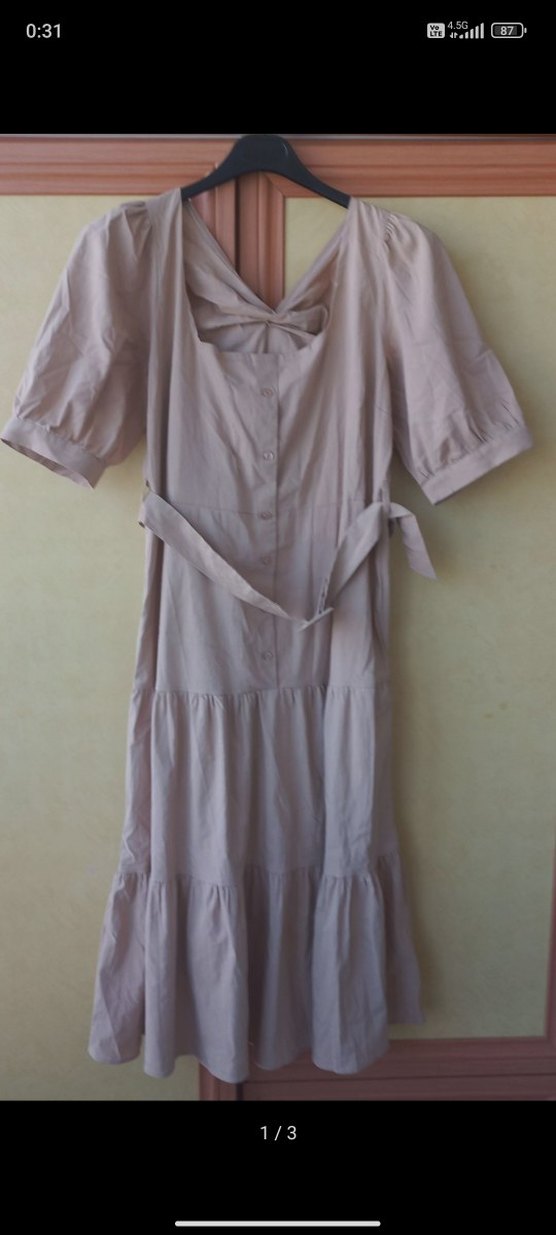 Bej renkli uzun keten elbise, bol kesim ve drapeli tasarıma sahiptir. V yaka, kısa balon kollu ve belde bağlama detaylıdır, günlük kullanıma uygundur.