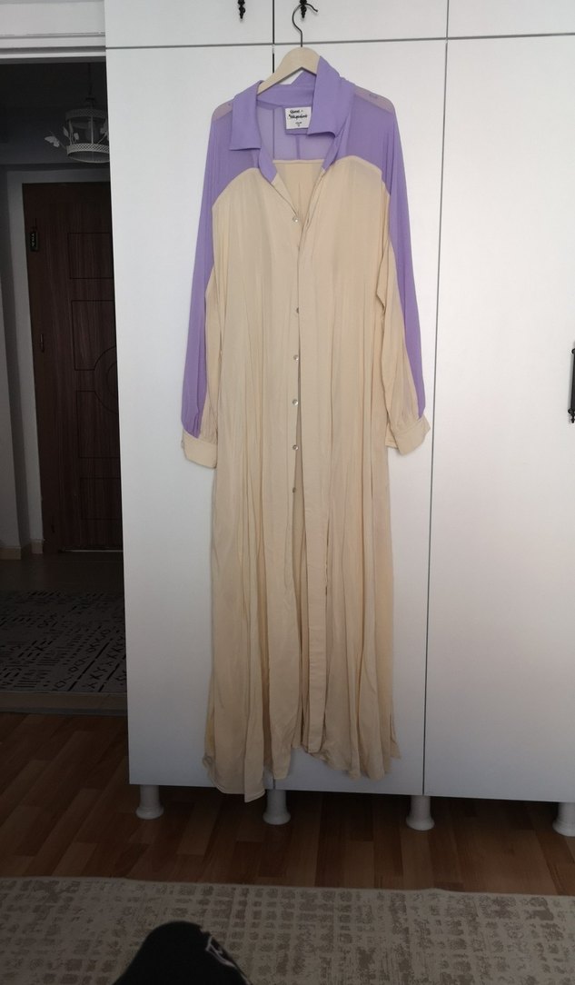 Bej renkli, bol kesim uzun keten elbise. Pile detaylı, uzun kollu ve yakası kesik yaka. Pastel lila detaylı, bohem tarzda günlük kullanıma uygun.