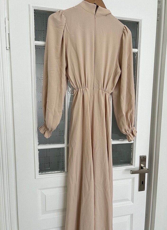 Bej renkli uzun keten elbise, drapeli detaylı ve yüksek yakalıdır. Uzun kollu ve bol kesim, klasik ve modern ofis stiline uygundur.