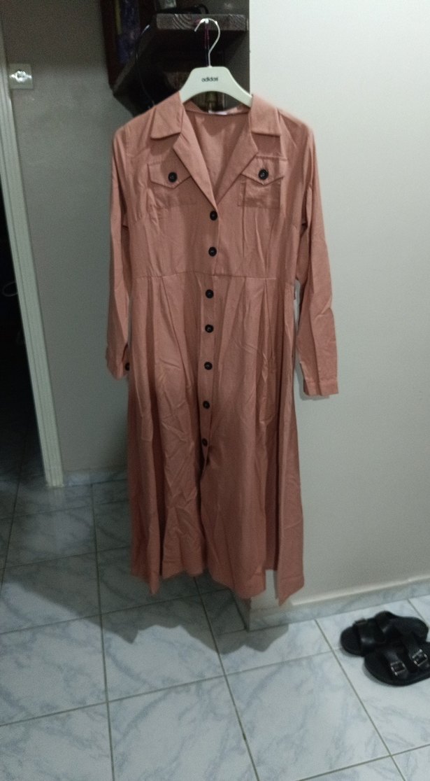 Bej renginde, keten kumaştan uzun kollu, düğmeli ve yakalı uzun elbise. Rahat kesimi ve minimalist tarzıyla günlük sokak modasına uygundur.