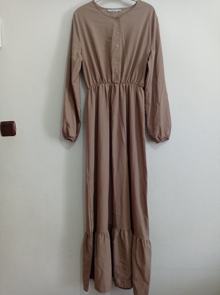 Bej renkli uzun keten elbise, düğmeli önü ve bol kesimiyle uzun kollu ve yuvarlak yakalıdır. Minimalist normcore tarzı günlük kullanıma uygundur.