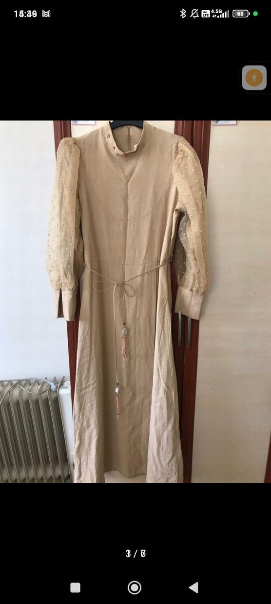 Bej uzun keten elbise, yüksek yakalı ve düğmeli detaylıdır. Nakışlı şeffaf uzun kollara sahiptir. Bağcıklı ve bol kesim bohem tarzda.