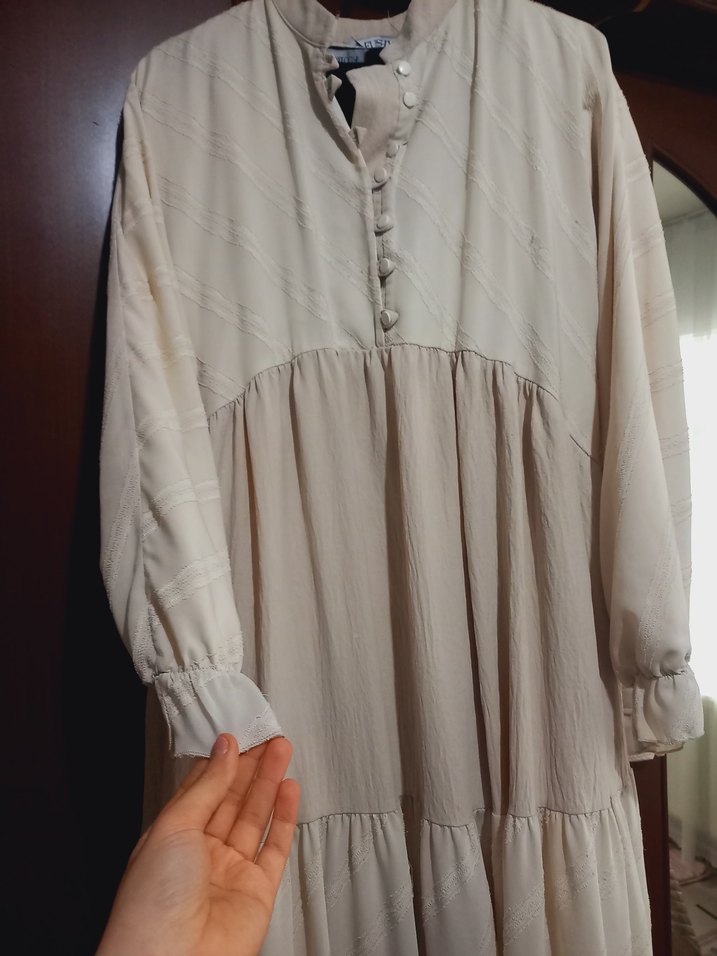 Bej renkli, keten kumaştan, düğmeli ve V yakalı uzun, bol kesim elbise. Uzun kollu ve bohem tarzda, günlük kullanım için uygun.