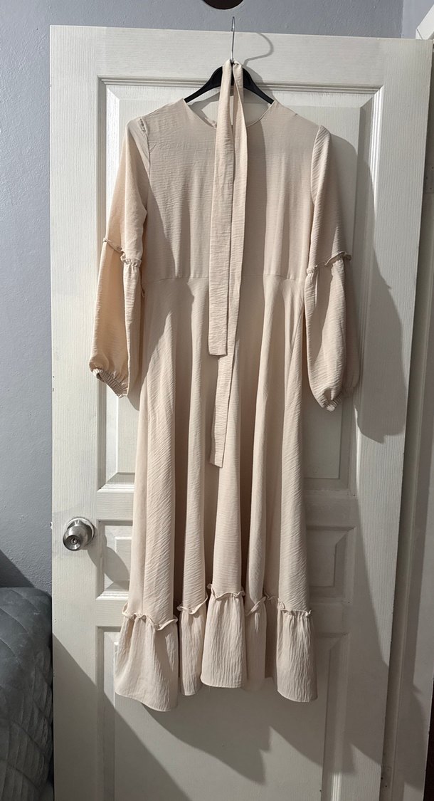Bej renkli, keten kumaştan uzun elbise, bol kesim ve fırfır detaylara sahiptir. Uzun kollu ve yuvarlak yakalıdır, bohem tarzda rahat bir seçenektir.