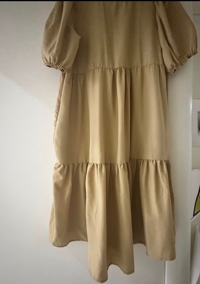 Bej renkte, keten kumaştan yapılmış, uzun ve bol kesim elbise. Fırfırlı detaylara ve yuvarlak yakaya sahip, minimalist bohem tarzı, günlük kullanıma uygun. Hiç bir deformesi yok.