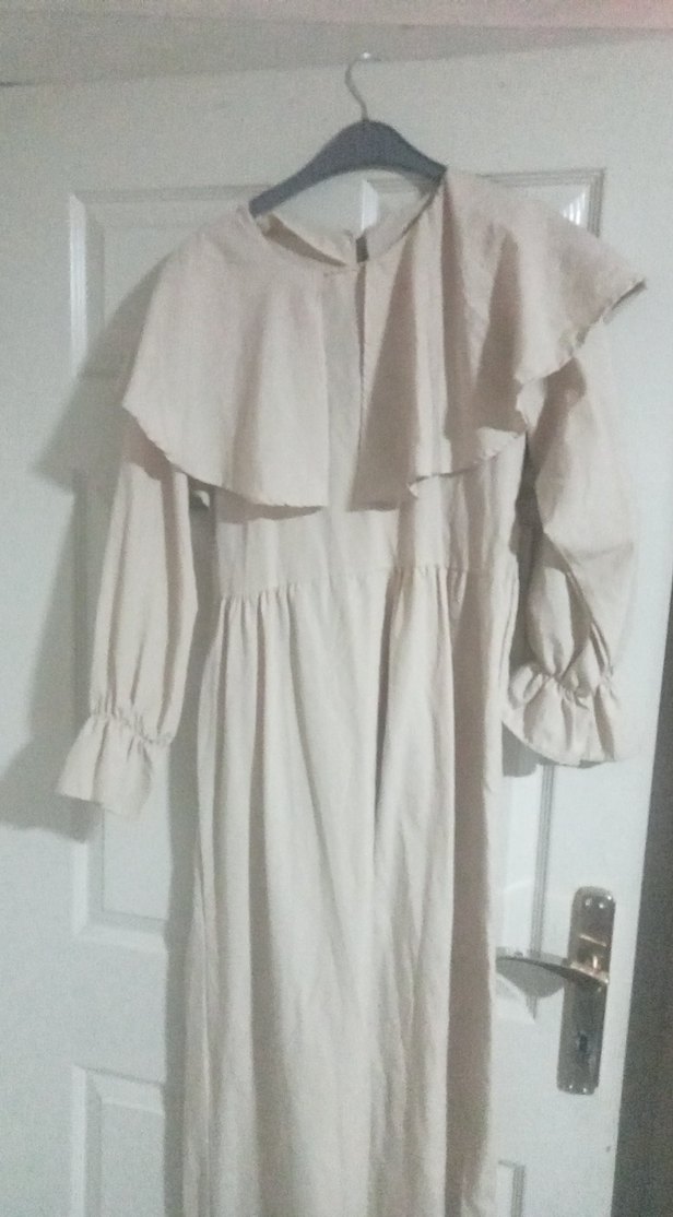 Bej renkli uzun keten elbise, bol kesim, fırfır detaylar, uzun kol ve yüksek yakaya sahip. Parisian bohem tarzını yansıtır, günlük kullanım için uygundur.