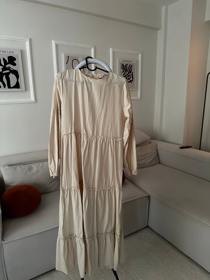 Bej renkte, keten kumaştan uzun boy, bol kesim elbise. Fırfırlı detayları, uzun kollu ve yüksek yakalı, minimalist bohem tarz için uygun. Sonda görünüşünü koydum, astarsız çok az giydim