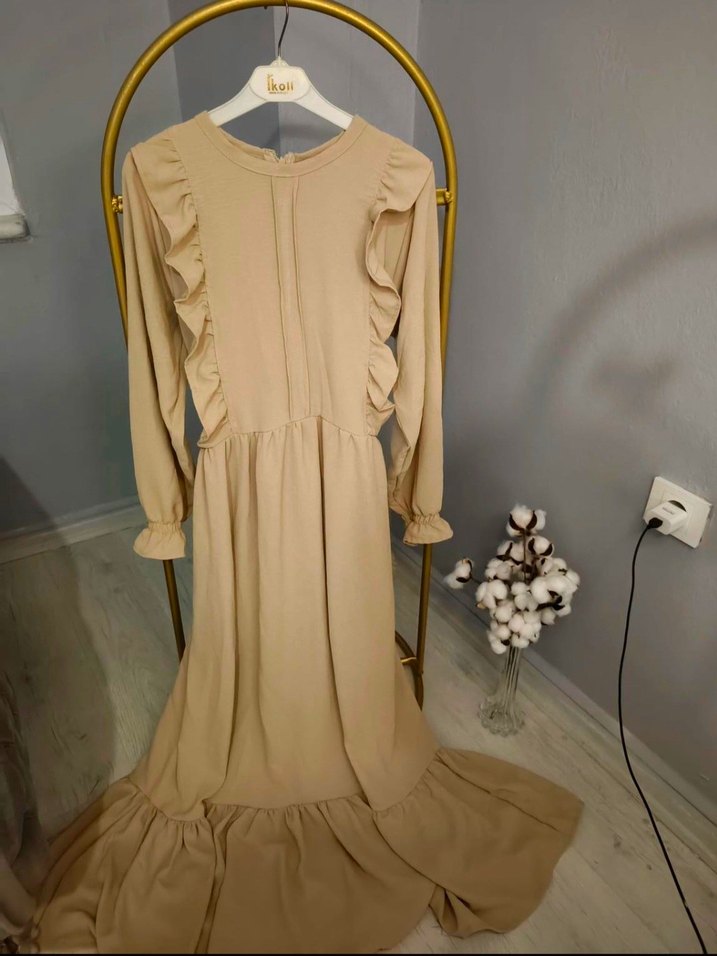 Bej uzun keten elbise, fırfır detaylı, uzun kollu ve bol kesimdir. Yuvarlak yaka ve pastel tonuyla bohem Paris ve modern tarzını yansıtır. Bır defa giyildi. Defosu asla yok. M larc uyumludur. Uzun ve rahat kesimdir. Kumaş özel tercih edildi. Marka temsilidir.