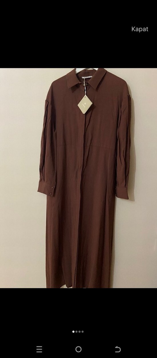 Bej keten uzun elbise, geniş kesim ve yakalı tasarıma sahiptir. Minimalist ve normcore tarzıyla günlük kullanıma uygundur. terzilik yapılmıştır omuz düşüktü kaldırılmış bir leke mevcut