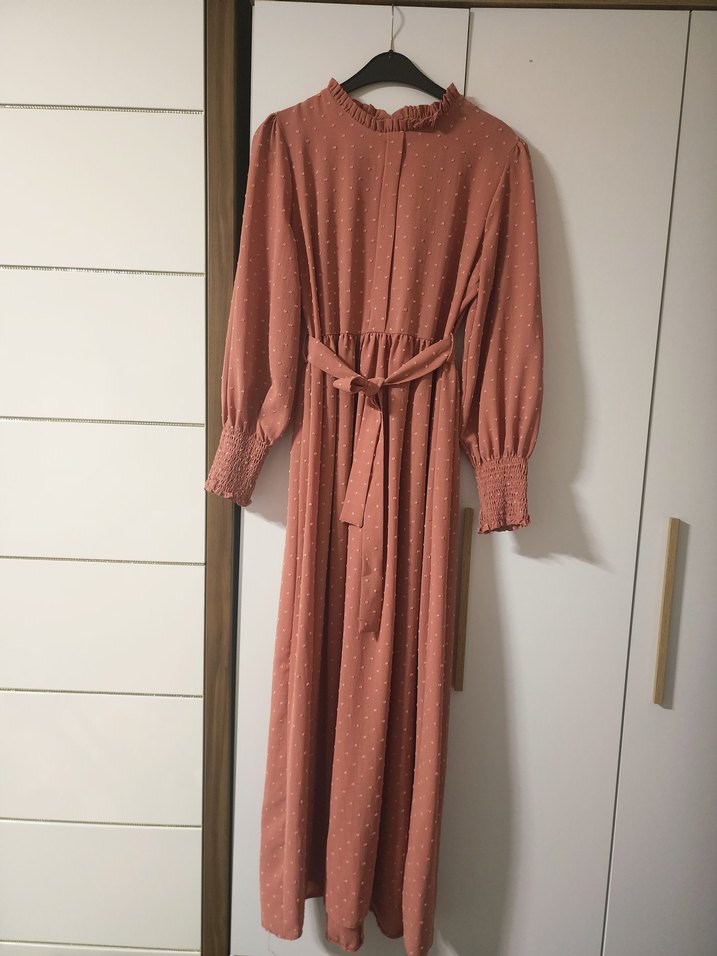 Bej renkli keten uzun elbise, yüksek yakalı ve pilili tasarıma sahiptir. Uzun kollu ve beli kuşaklı, rahat bohem stil sunar. 135 cm boyu. somon rengi kalibi dar.