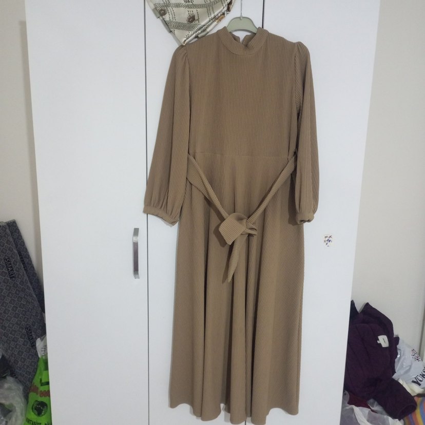 Bej renkli keten uzun elbise, pilili detaylara ve bol kesime sahiptir. Yüksek yakalı ve uzun kolludur, modern klasik tarzda günlük kullanıma uygundur.