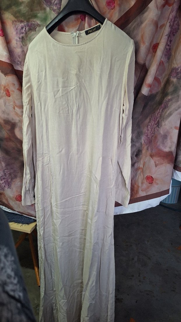 Bej renkli, uzun kollu, salaş kesim keten elbise. Drapeli tasarımı ve yuvarlak yakasıyla günlük kullanıma uygun, minimalist bohem tarzda bir parça.