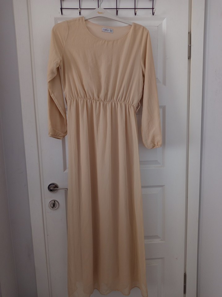Bej uzun keten elbise, salaş kesimi ve drapeli tasarımıyla öne çıkar. Uzun kollu ve yuvarlak yakalı bu elbise, minimalist ve bohem tarzı yansıtır.