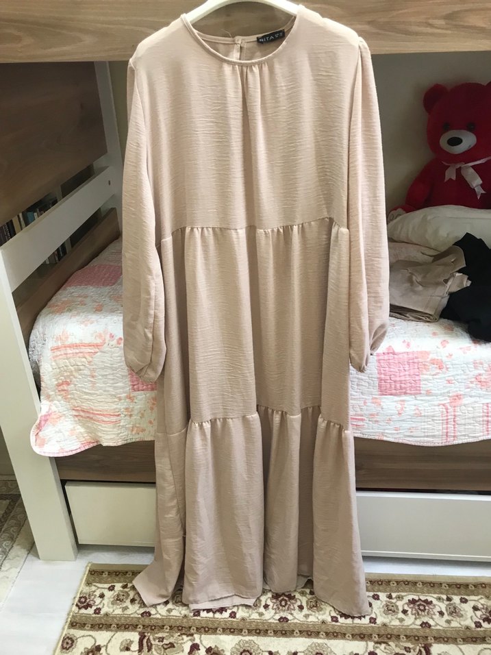 Bej renkte, uzun elbise. Salaş kesim ve pile detayları bulunur. Yuvarlak yaka ve askılı kollarla günlük kullanıma uygun, sade ve bohem tarzda.