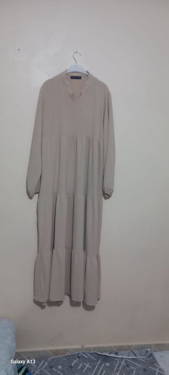 Bej renkli keten uzun elbise, bol kesim, uzun kollu ve V yakalıdır. Günlük kullanıma uygun sade ve mütevazı tarzda.