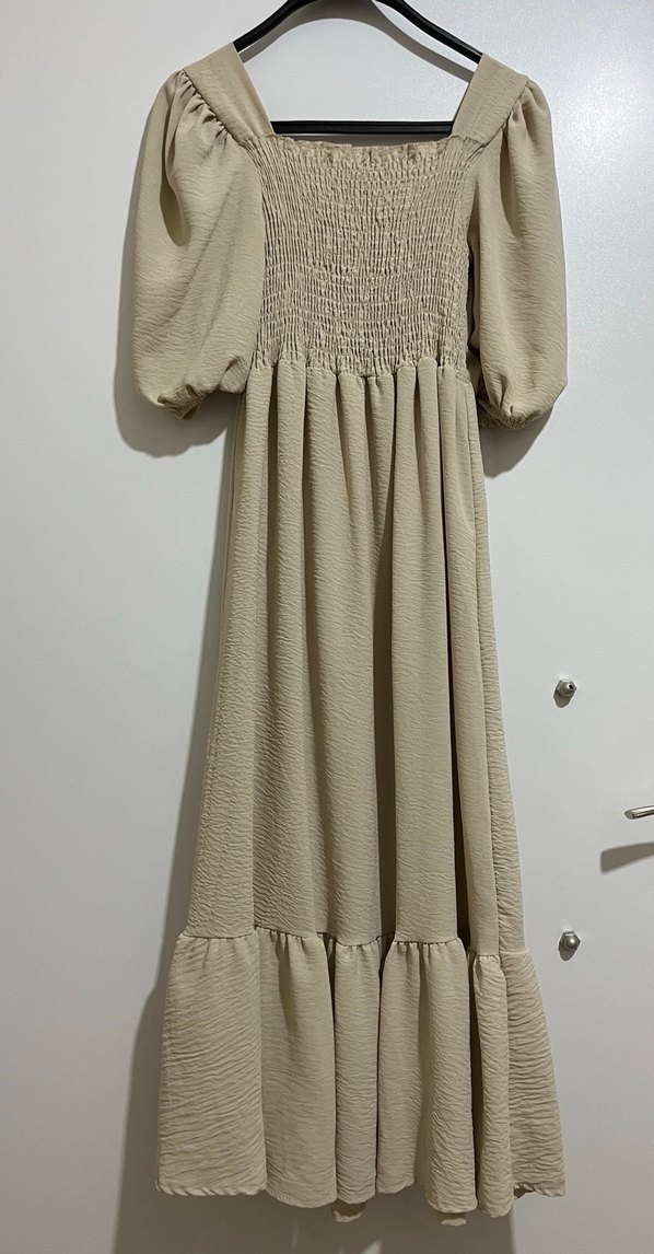 Bej uzun keten elbise, volan detaylı, bol kesim ve tekne yaka. Bohem tarzda, askılı kollu, günlük kullanıma uygun.