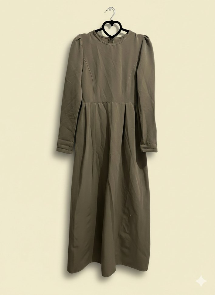 Bej renkli uzun keten elbise, yüksek yakalı ve uzun kolludur. Salaş kesimi ve drapeli tasarımı minimal ve normcore tarzı yansıtır, günlük kullanım için uygundur.