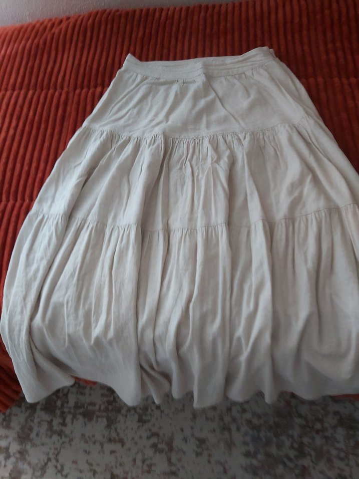 Bej renkli, keten kumaştan pilili ve bol kesim uzun etek. Bohem tarzıyla günlük kullanıma uygundur. minik dokuma hatası var resimde