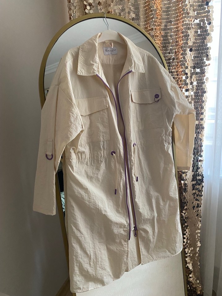 Bu açık bej renk keten ceket, uzun kollu ve kesik yakalıdır. Düğmeli, bol kesim ve günlük kullanıma uygun sokak stili sunar.